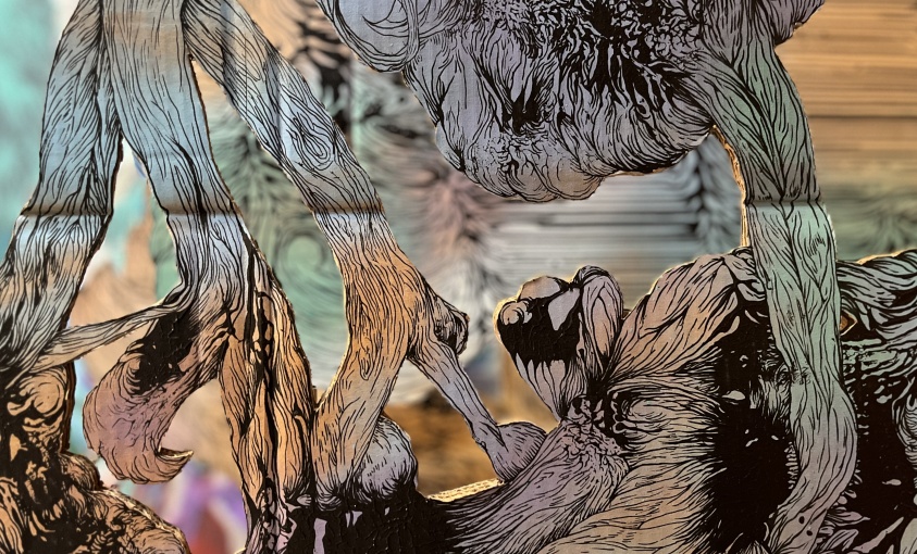 Chaque tableau ou installation se construit comme un organisme vivant qui évolue au sein d’une architecture linaire et inversement. Les formes s’entremêlent et recréent d’autres forment qui a leur tour, deviennent autonomes, comme un cycle de la vie.